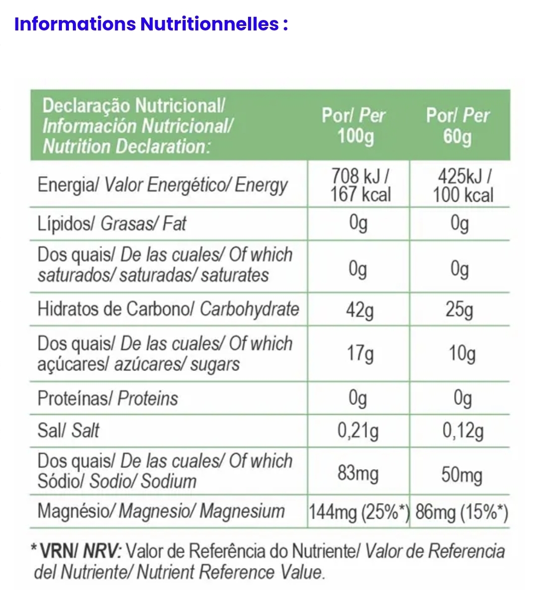 Eau, maltodextrine, sirop de fructose, arôme, carbonate de magnésium, sel marin, caféine, Paullinia Cupana K (extrait sec de fruit, 22% caféine) [0,1%].