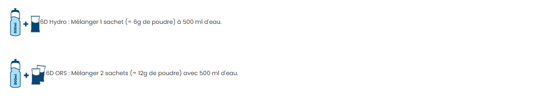 En utilisant une double dose (= 2 sachets dans 500 ml d'eau), 6D HYDRO devient une "solution de réhydratation orale" (SRO) typique. La SRO 6d contient 7,5 g de glucose sous forme de maltodextrine et 900 mg de sodium par flacon de 500 ml. La combinaison de sodium et de glucose, ainsi que la solution hypotonique (± 210 mmol/kg) maximisent l'absorption des liquides dans l'intestin grêle. Par conséquent, la SRO 6D est la boisson sportive idéale pour les athlètes qui non seulement transpirent beaucoup, mais transpirent également beaucoup de sels. De plus, lors d'un séjour de longue durée dans un environnement chaud et humide (= climat tropical), la double dose est souvent recommandée pour maintenir un équilibre optimal des fluides et des électrolytes. En outre, grâce à sa teneur élevée en sel, la SRO 6D est la boisson sportive préférée pour "préhydrater" le corps avant l'exercice et pour le "réhydrater" après l'exercice. En particulier après des séances d'endurance prolongées et des compétitions où les pertes de liquide et de sel sont connues pour être très importantes et où de grands volumes de liquides doivent être consommés pour rétablir l'équilibre des liquides après l'exercice. Pour une utilisation standard pendant un exercice d'endurance dans un environnement chaud et humide, la boisson ISOTONIC SPORTS DRINK 6D est recommandée, car elle contient déjà 450 mg de sodium par 500 ml d'eau ainsi que 30 g d'hydrates de carbone. Cependant, il peut être nécessaire pour certains athlètes d'absorber du sel supplémentaire lors d'un exercice d'endurance prolongé (> 3 heures) sous la forme de la SRO 6D.