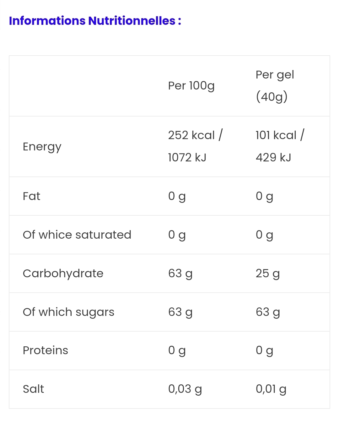 Consommer 1 à 2 gels par heure d'exercice d'endurance. Pour chaque gel consommé, boire au moins 250 ml d'eau.